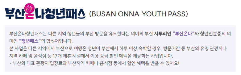 “부산온나청년패스”는 부산 외 지역에 거주하는 청년(1985~2007년생)을 대상으로 한 관광지원 프로젝트입니다. 부산에서 '1박 이상 숙박' 시, 다양한 제휴시설을 '할인가'로 이용할 수 있도록 돕는 정책입니다. 숙박 증빙만 제출하면 제휴 관광지, 카페, 베이커리, 음식점에서 무제한 할인 가능!