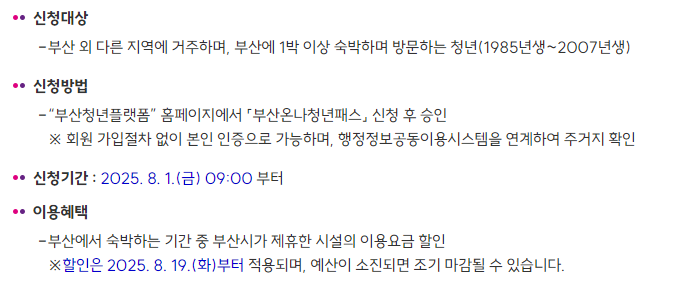부산여행 계획 중이신가요? 지금 신청하면 숙박만 해도 다양한 관광지·카페·맛집에서 대폭 할인 혜택을 누릴 수 있습니다. 🎉 특히 2025년 여름, 부산 외 지역 청년들을 위한 "부산온나청년패스" 혜택이 역대급입니다! 시간 지나면 마감될 수 있으니 지금 바로 체크하세요.👇